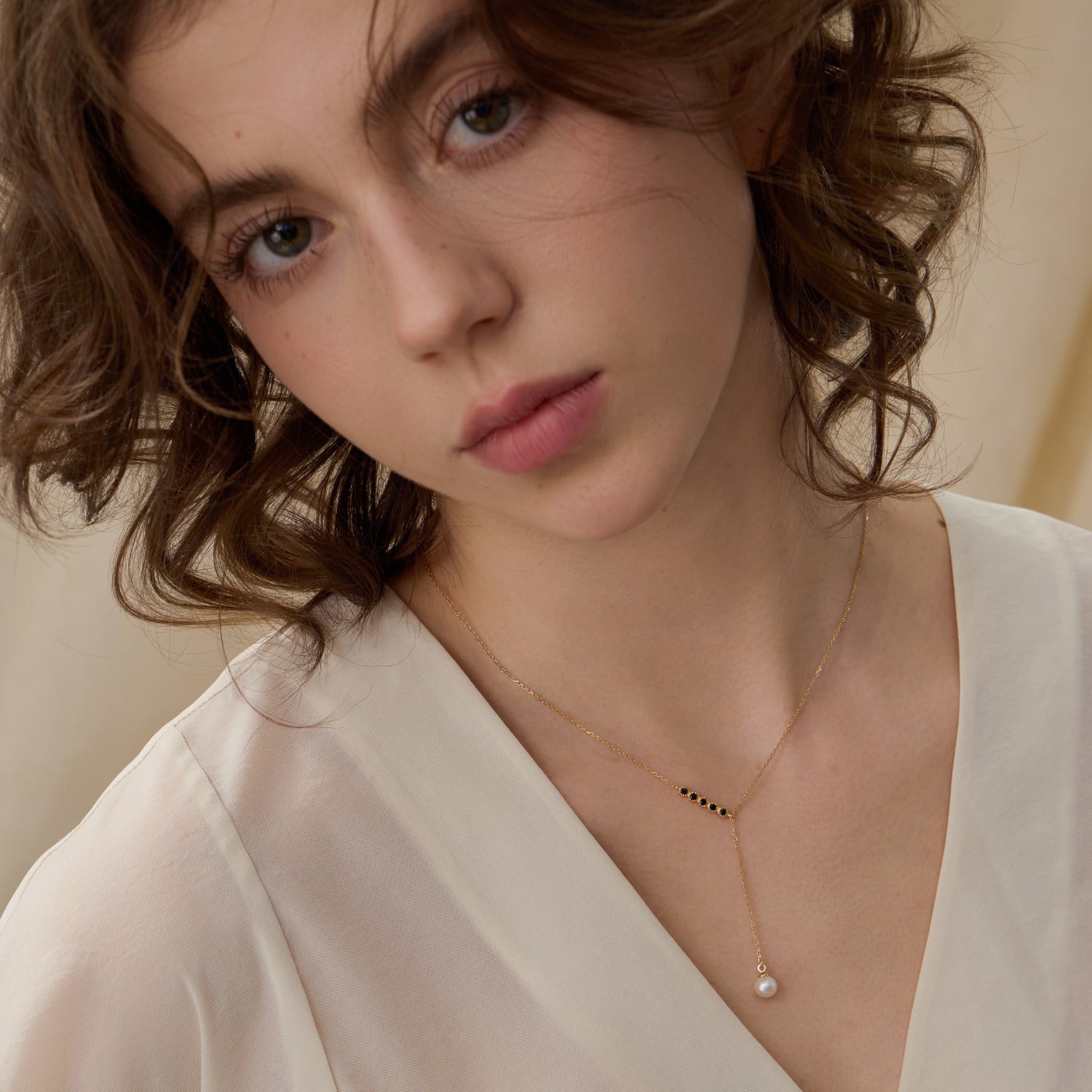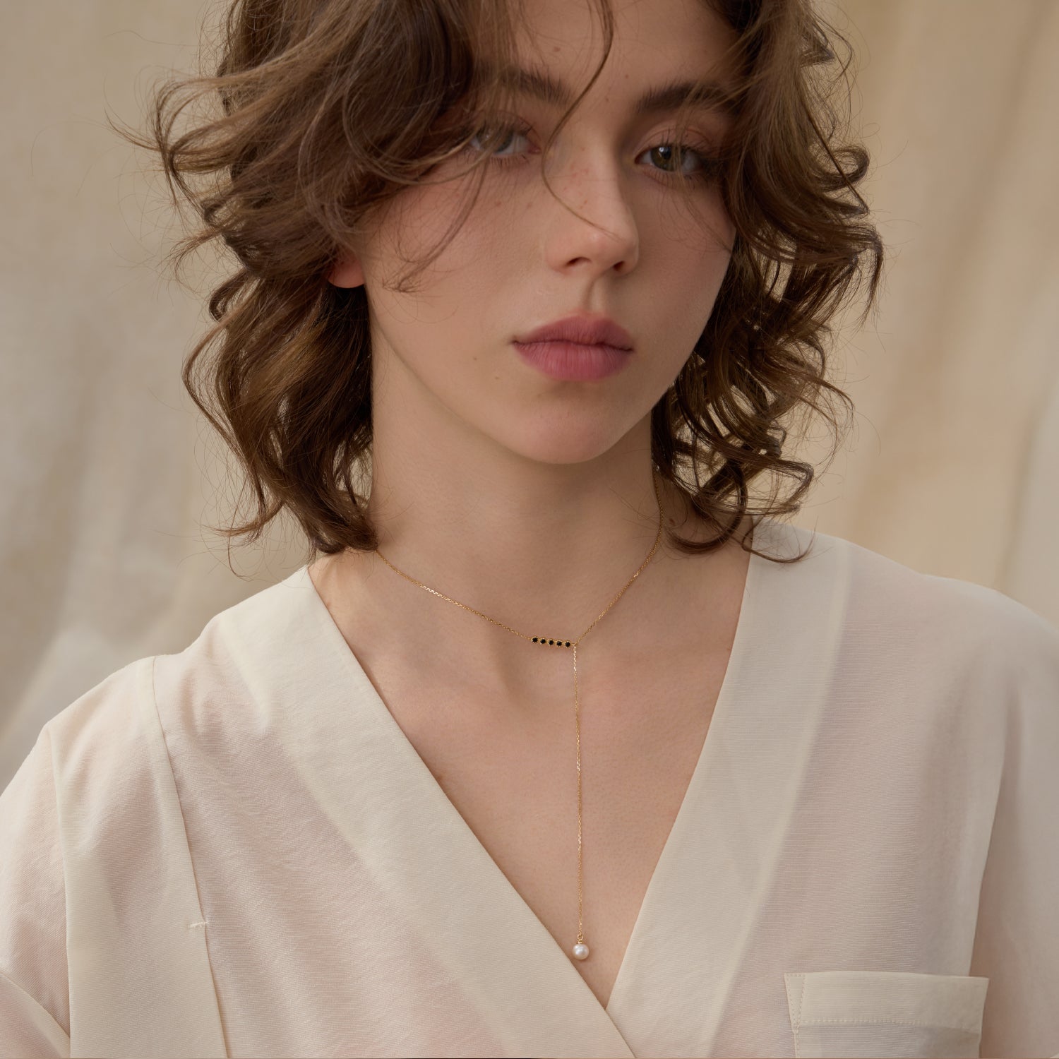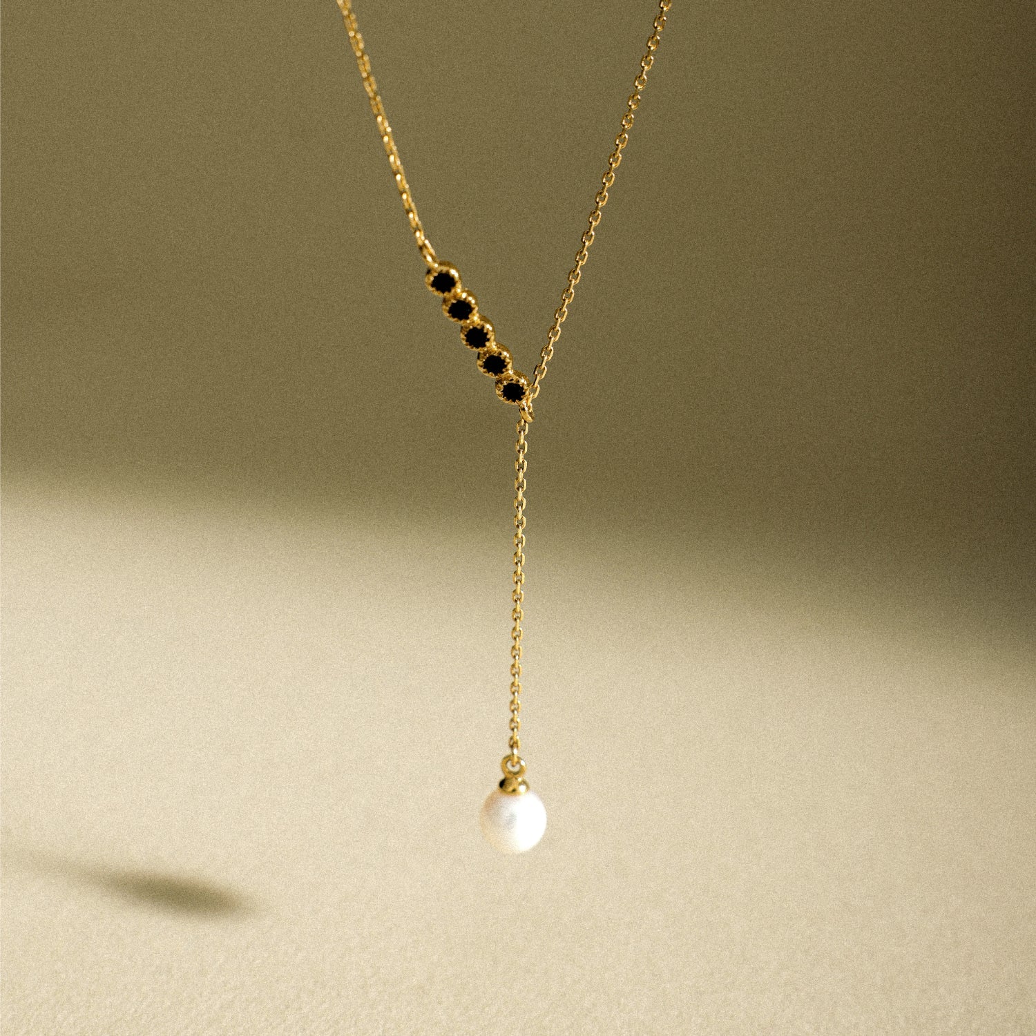 オーガニックデザインと一粒のパールが特徴的なラリアットネックレス。ブラックアゲートの美しい輝きが加わり、シンプルながらも存在感を放つ逸品。時代を超えて、長く愛用できるデザインです。