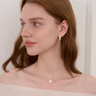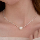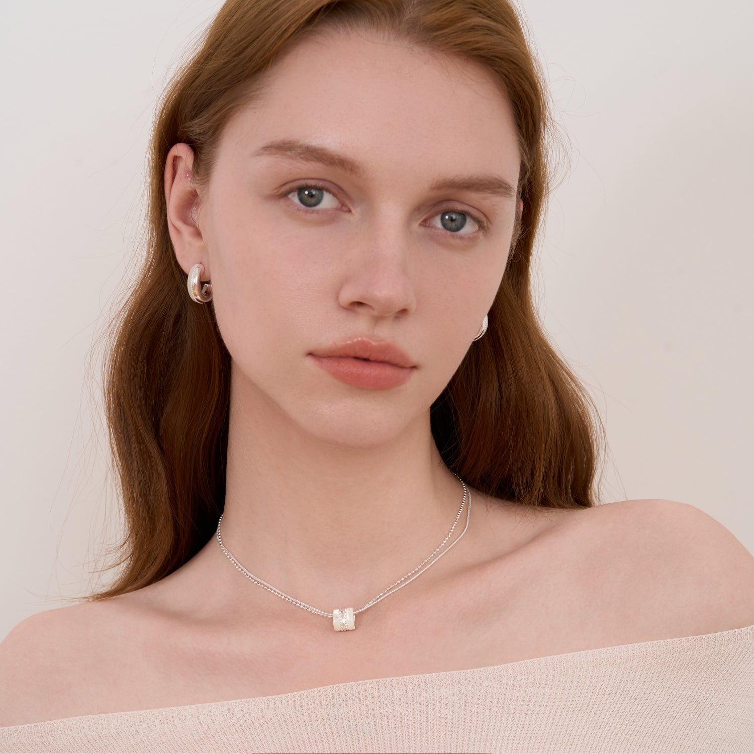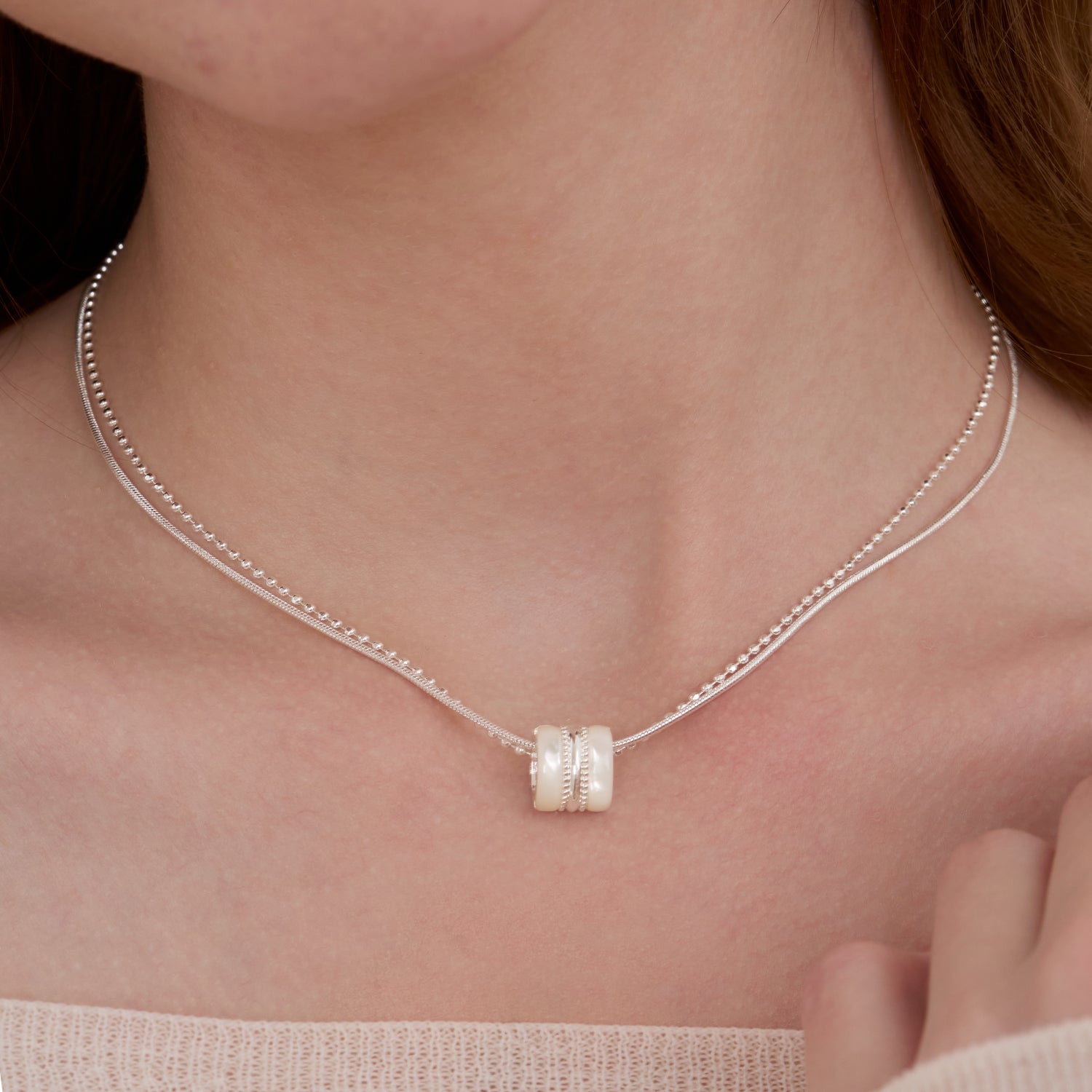 エレガントなデザインで、丸型ボックスチェーンと間隔を空けたビーズチェーンの2種類を組み合わせ、シグネチャーのマザーオブパールペンダントをあしらいました。