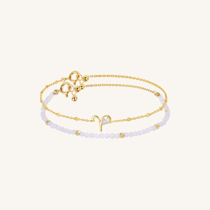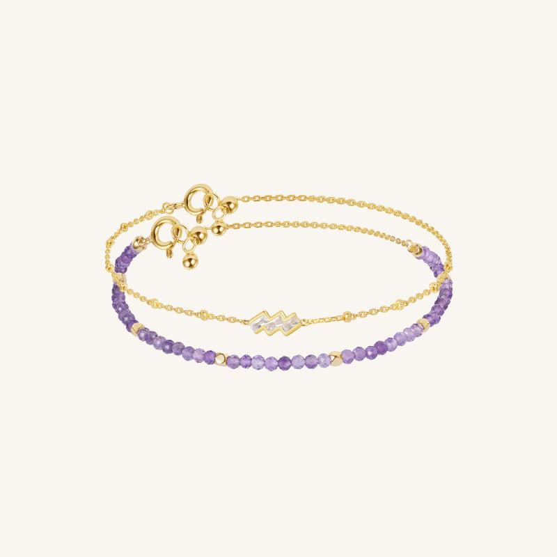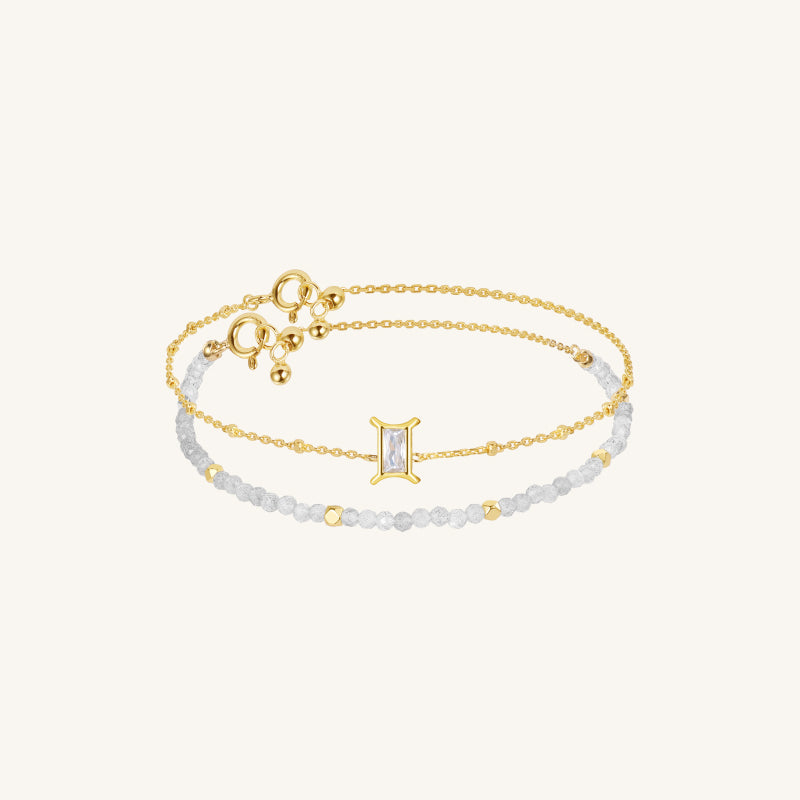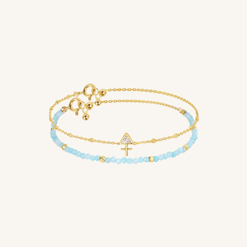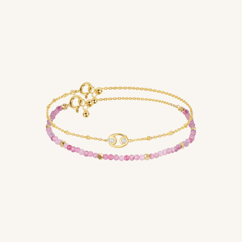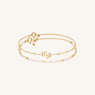 二層構造の星座誕生石ブレスレットをご覧ください。このブレスレットは、あなたの誕生石と星座を美しく際立たせ、意味深いシンボルを融合させています。ブレスレットは2つのパーツに分離可能。ビーズブレスレット単体でも、チェーンブレスレット単体でも、装いに合わせてお選びいただけます。